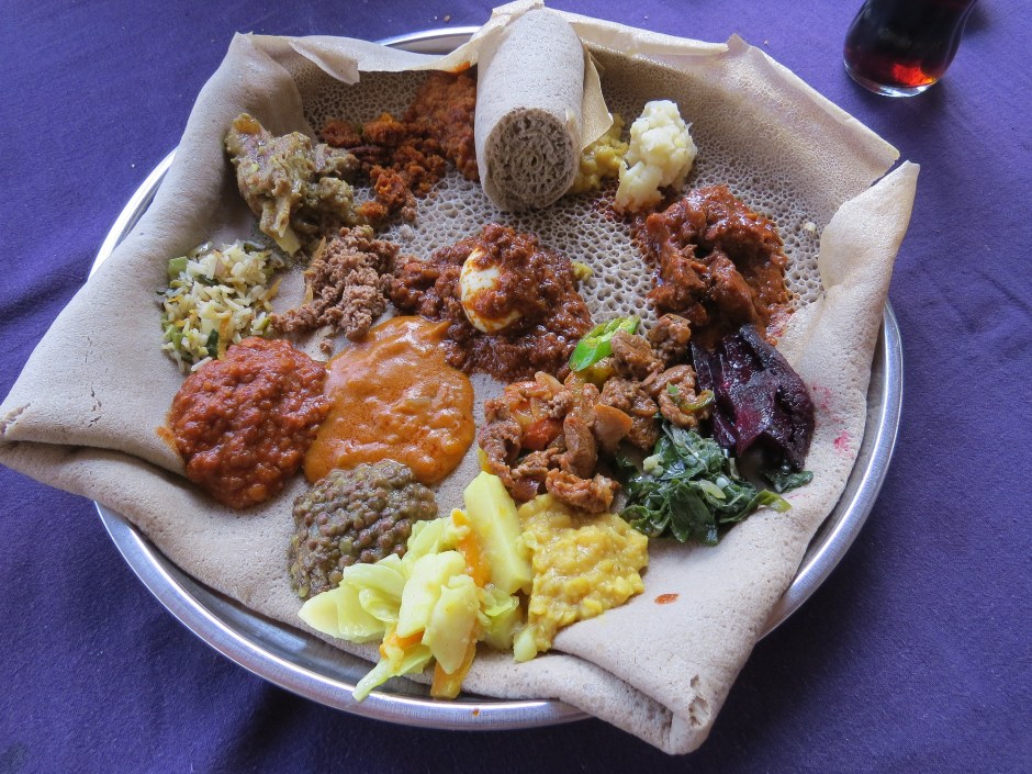 Gondar – 4 Sisters Restaurant: A typical Ethiopian dish. Different kind of meat, vegetables and sauces placed on an Injeera. The Injeera is a part of every Ethiopian meal. It is a sponge like pancake with a slightly sour taste made of an endemic grain called teff.