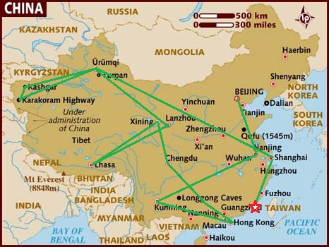 Beijing – Nanjing – Kunming – Hongkong – Guilin – Chengdu – Xining – Lhasa – Lanzhou – Ürümqi – Kashgar – Tashkurgan – Ürümqi – Shanghai – Xiamen. Wie ein Maikäfer auf Crack.