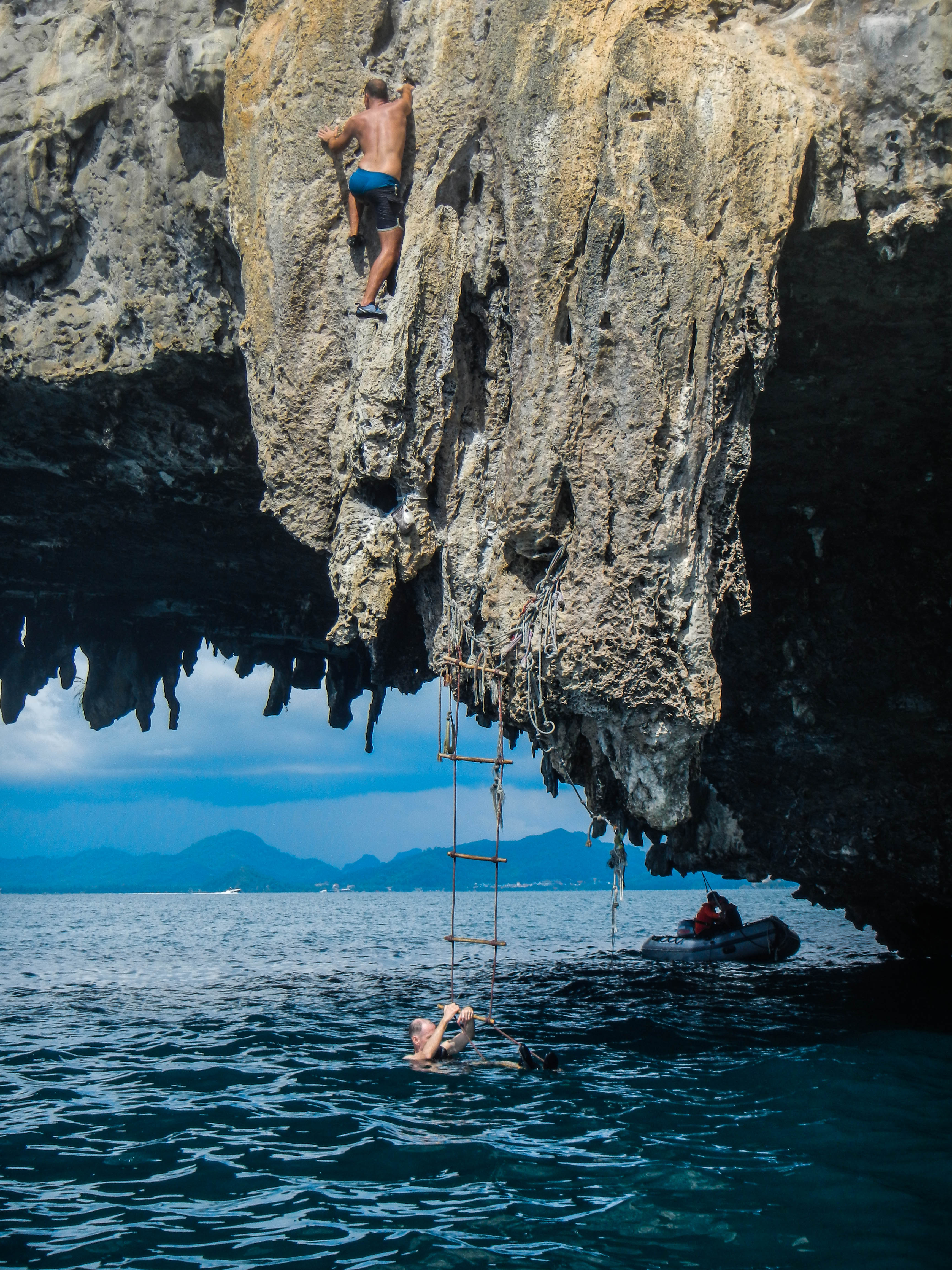 DSCN4424 Thailand – Me doing deep water free soloing in the bay of Krabi. No strings attached. When you fall, you fall. The water was deep but hitting the surface in a wrong angle could still hurt like hell.