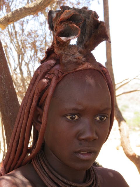 IMG_2134 Namibia – Somewhere in the middle of nowhere: A young Himba woman wearing the traditional hairstyle of her tribe. The hair is wrapped in clay which they also use for their skin.