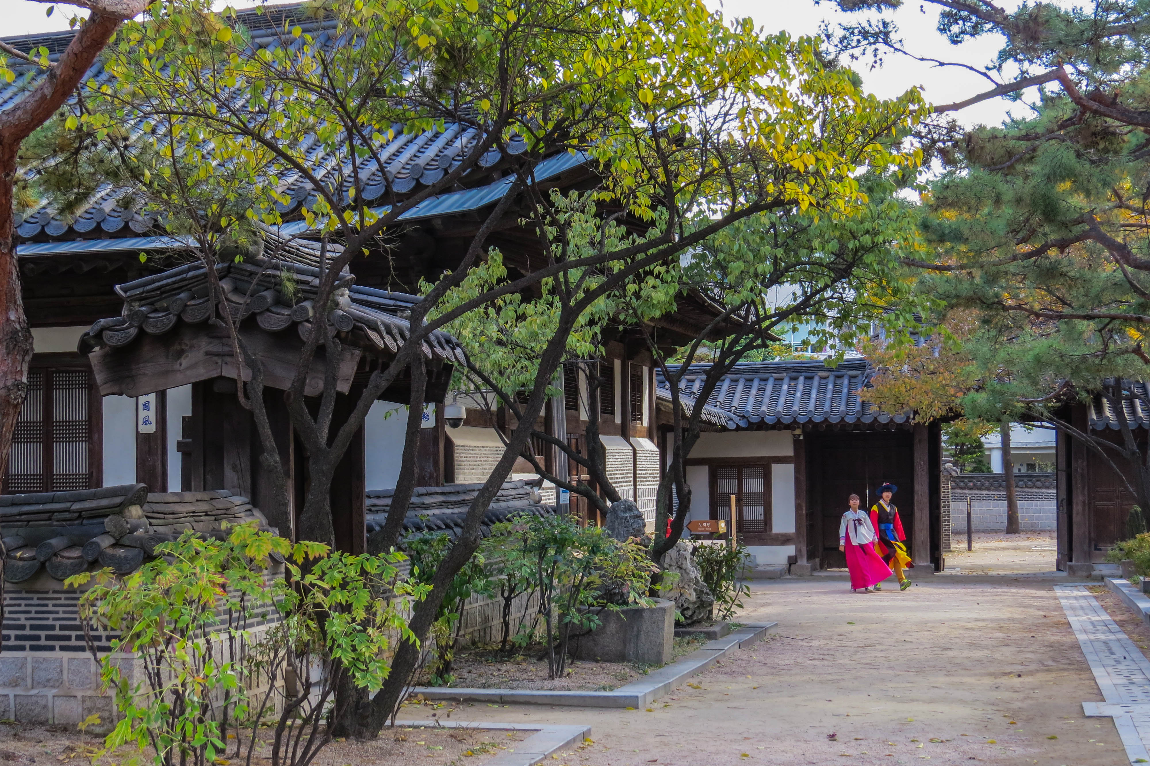 Korea – A newly wed couple strolling through the garden of the royal residence.