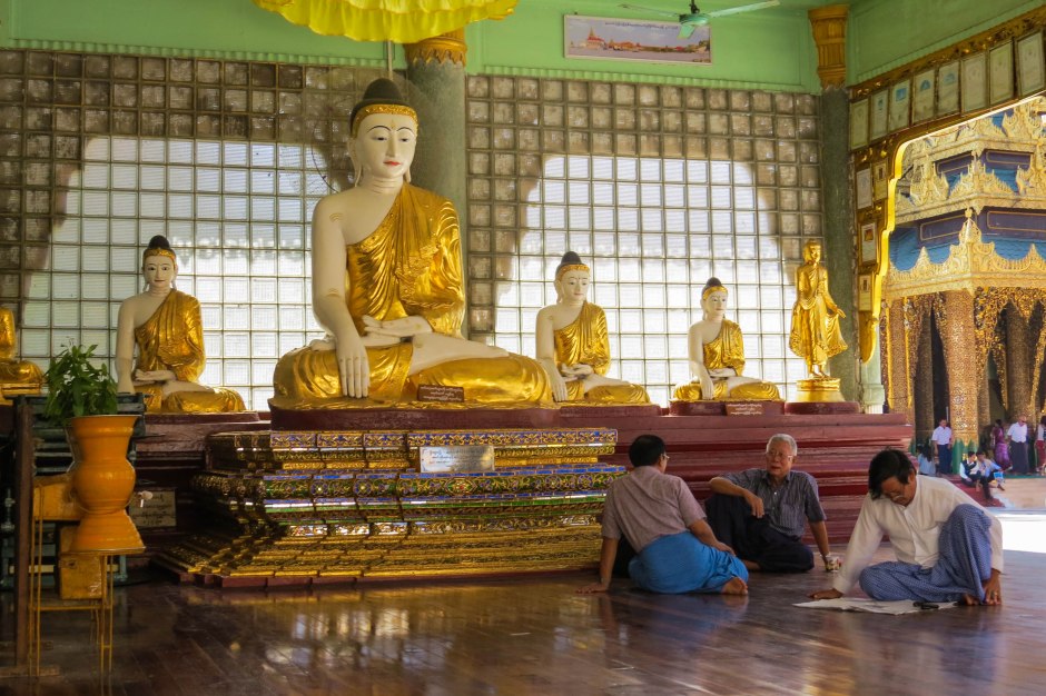 Yangon – Local men hanging out in the Shwedagon Pagoda wearing the traditional longyi.